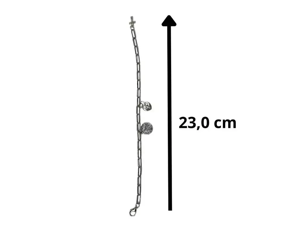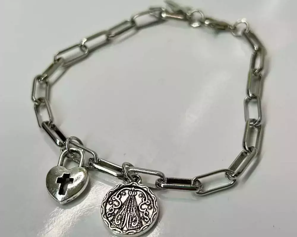 Pulseira Aço Inox Prateada Elos Ovais Medalha Nossa Sra. Aparecida e Cadeado Coração 22cm – 12 Unidades